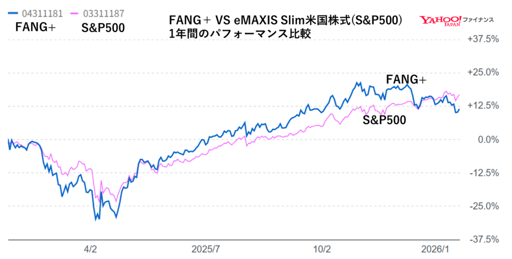 次にFANG+とS&P500のインデックスファンドの騰落率の比較を見てみましょう。