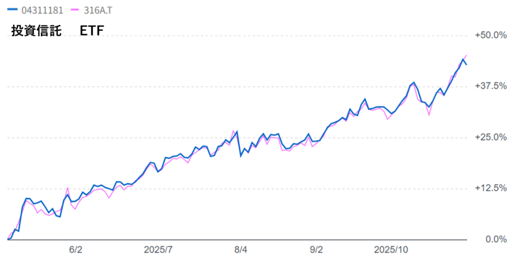 同じ期間で比較した場合、投資信託よりもETFの方が優れたパフォーマンを示していますね。