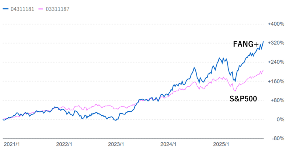 ・FANG+は1年、3年、5年でそれぞれ45.0%, 302%, 326%、