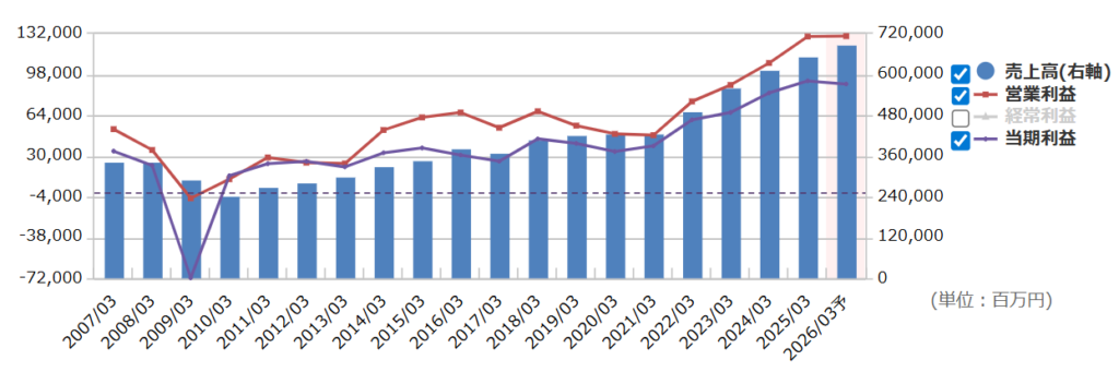 売上高、営業利益、当期純利益ともに右肩上がりに成長している傾向を持つ企業です。