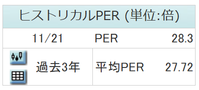 ・現在PER 28.3 > 過去3年の平均PER:27.72 ⇒ 割高